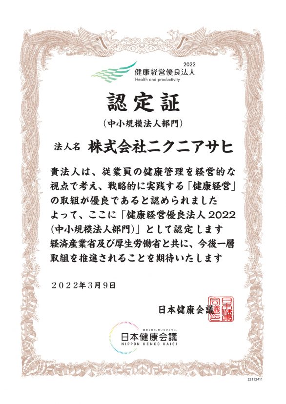 この度、当社は「健康経営優良法人2022(中小規模法人部門)」の認定を受けました。(2022年3月9日付)