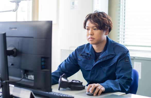 管理部生産管理課生産計画係に所属し、営業が受注した製品や部品の納期確認や、社内の加工・組立の統制業務を担当しています。